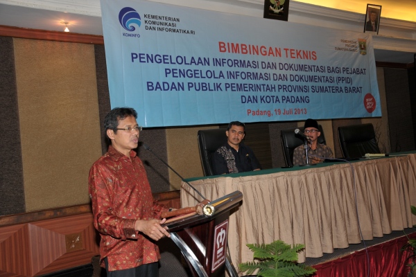 Padang – Gubernur Irwan Prayitno membuka secara resmi Bimtek Pejabat Pengelola Informasi dan Dokumentasi (PPID) Pemerintah Provinsi Sumatera Barat dan Kota Padang, yang diselenggarakan oleh Kementerian Komunikasi dan Informatika RI, di Padang (19/7). Hadir dalam kesempatan itu Direktur Informasi dan Komunikasi Publik, Tulus Subarjono, kepala Biro Humas Irwan S.Sos, MM. serta utusan pejabat SKPD di lingkungan Pemprov dan Kota Padang sebanyak 150 orang.