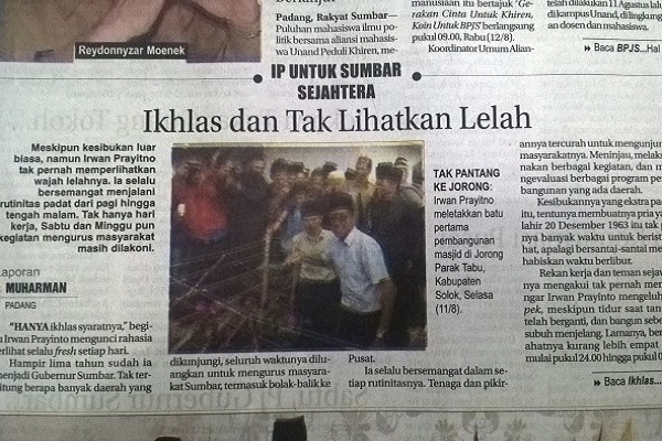 Meskipun kesibukan luar biasa, namun Irwan Prayitno tak pernah memperlihatkan wajah lelahnya. Ia selalu bersemangat menjalani rutinitas padat dari pagi hingga tengah malam. Tak hanya hari kerja, Sabtu dan Minggu pun kegiatan mengurus masyarakat masih dilakoni.