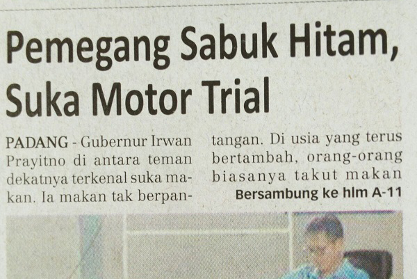 Irwan memang tak sering terlihat bermain bola. Tapi, untuk urusan menunggangi motor trial, orang-orang pasti sudah mengenalnya. Warga di pedalaman Nagari Garabak Data, Kabupaten Solok, misalnya, terheran-heran ketika seorang laki-laki datang menunggangi motor trial. Entah angin apa, tiba-tiba nagari yang sulit ditempuh dengan akses jalan yang terbatas itu dijadikan arena motor trial. Tapi, keheranan warga Garabak Data terjawab dengan hati berbunga-bunga. Rupanya, lelaki yang bermotor trial adalah Gubernur Irwan Prayitno yang sengaja mengunjungi warganya di daerah pedalaman.
