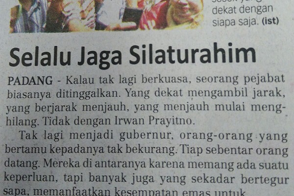 PADANG-Kalau tak lagi berkuasa, seorang pejabat biasanya ditinggalkan. Yang dekat mengambil jarak, yang berjarak menjauh, yang menjauh mulai menghilang. Tidak dengan Irwan Prayitno. Tak lagi menjadi Gubernur Sumbar, orang-orang yang bertamu kepadanya tak bekurang. Tiap sebentar orang datang. Mereka di antaranya karena memang ada suatu keperluan, tapi banyak juga yang sekadar bertegur sapa, memanfaatkan kesempatan emas untuk berjumpa. Maklum, ketika masih menjadi gubernur, dengan kegiatan yang sangat padat, tak gampang bisa berjumpa dengan Irwan.