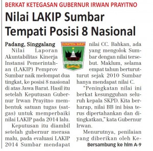 Nilai Laporan Akuntabilitas Kinerja Instansi Pemerintahan (LAKIP) Pemprov Sumbar naik melompat dua tingkat, ke posisi 8 nasional di atas Jawa Barat. Hasil itu setelah Keputusan Gubernur Irwan Prayitno membentuk satuan tugas (satgas) untuk memperbaiki nilai LAKIP pada 2014 lalu.