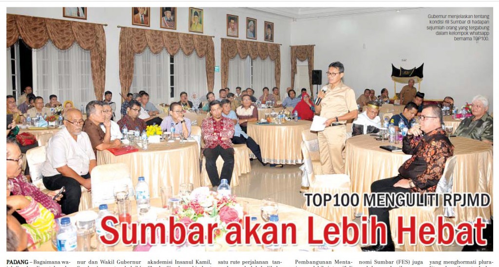 Ini menurutnya perlu mendapat perhatian semua kalangan agar bisa memahami kendala yang ada. Itu juga sebabnya untuk pertama kali satu grup diskusi bebas di whatsapp TOP100 diajak oleh Guber-nur dan Wakil Gubernur Sumbar ‘mengatam haluih’ draft Rencana Pembangunan Jangka Menengah Daerah (RPJMD) Provinsi Sumatera Barat 2016-2021.