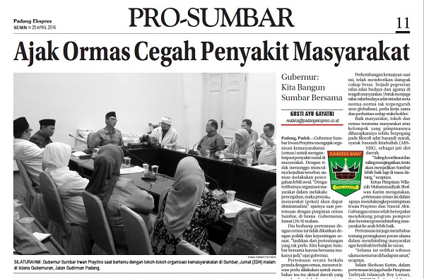 Padang, Padek—Gubernur Sumbar Irwan Prayitno mengajak organisasi Kemasyarakatan (ormas) untuk mengantisipasi penyakit sosial di masyarakat. Dengan tidak menunggu munculnya kejadian tersebut, namun melakukan pencegahan lebih awal. “Dengan terlibatnya organisasi masyarakat dalam melakukan pencegahan, maka penyakit masyarakat (pekat) akan dapat diminimalisir,†ujarnya saat pertemuan dengan pimpinan ormas Sumbar, di Istana Gubernuran, Jumat (24/4) malam.