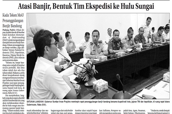 Padang, Padek—Pekan depan, kepala daerah di Sumbar bakal meneken Momerandum of Understanding (MoU) untuk mengantisipasi dampak bencana banjir bandang. Dalam penanggulangan banjir tersebut, juga dilibatkan Tentara Nasional Indonesia (TNI), Kepolisian, Basarnas, Palang Merah Indonesia (PMI), para relawan serta pencinta alam.
