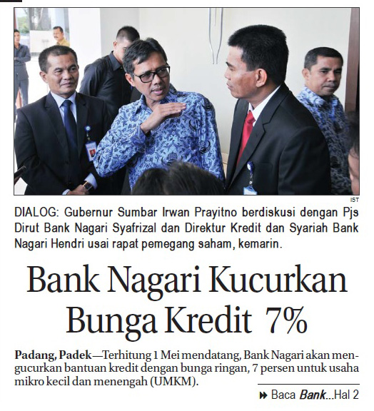 Padang, Padek—Terhitung 1 Mei mendatang, Bank Nagari akan mengucurkan bantuan kredit dengan bunga ringan, 7 persen untuk usaha mikro kecil dan menengah (UMKM). Bunga rendah ini dapat membantu UMKM mendapat permodalan.