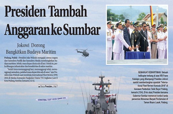 “Sudah lama memunggungi laut, memunggungi teluk, memunggungi samudera, padahal masa depan kita ada di sana,†ujar Presiden Joko Widodo saat membuka International Fleet Review (IFR) 2016 di Markas Komando Pangkalan Utama TNI Angkatan Laut II Kota Padang, Sumbar, kemarin (12/4).