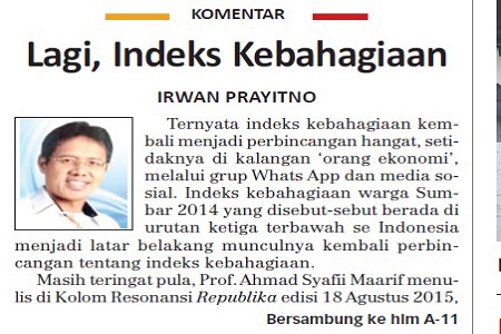 Ternyata indeks kebahagiaan kembali menjadi perbincangan hangat, setidaknya di kalangan ‘orang ekonomi’, melalui grup Whats App dan media sosial. Indeks kebahagiaan warga Sumbar Tahun 2014 yang disebut-sebut berada di urutan ketiga terbawah se Indonesia menjadi latar belakang munculnya kembali perbincangan tentang indeks kebahagiaan.