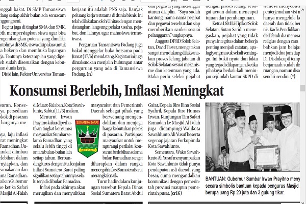 Dampaknya, laju inflasi Sumatera Barat meningkat drastis selama Ramadhan. Untuk itu, masyarakat diimbau agar tidak berlebihan dalam membeli, menyiapkan, dan mengkonsumsi makanan dan minuman selama Ramadhan. Hal itu disampaikan Gubernur Irwan Prayitno ketika Safari Ramadhan ke Masjid Al-Falah di Muaro Kalaban, Kota Sawahlunto, Sabtu (11/6) malam.