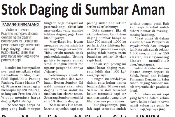 Sebelumnya Kepala Dinas Peternakan dan Kesehatan Hewan Sumbar, Erinaldi mengatakan stok daging Sumbar untuk Ramadhan dan lebaran aman. Sekarang Sumbar memiliki stok 10 ribu ton daging.