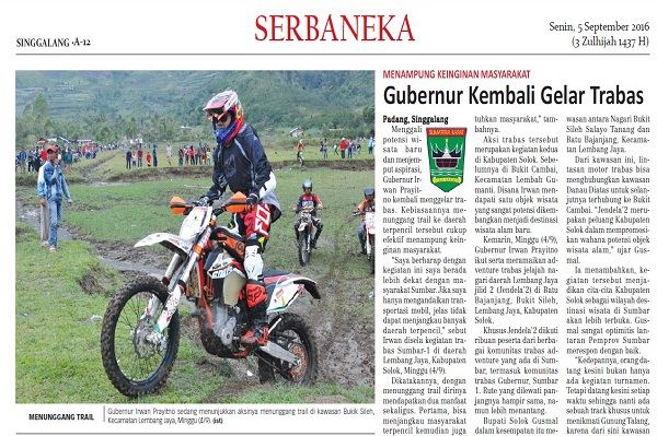 Menggali potensi wisata baru dan menjemput aspirasi, Gubernur Irwan Prayitno kembali menggelar trabas. Kebiasaannya menunggang trail ke daerah terpencil tersebut cukup efektif menampung keinginan masyarakat.