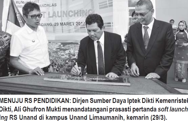 Dirjen Sumber Daya Iptek Dikti Kemenristek Dikti, Ali Ghufron Mukti mengemukakan sewaktu soft launching RS Unand di kampus Unand Limaumanih, Pauh, Padang, kemarin (29/3). Soft launching yang ditandai dengan penandatanganan prasasti oleh Ali Ghufron ini, menandai mulai beroperasinya rumah sakit pendidikan ini.