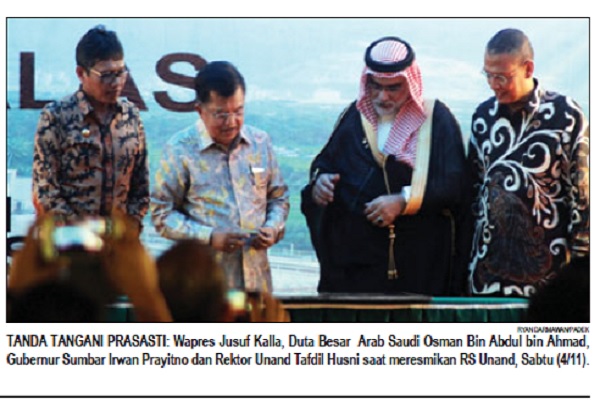 Ia berharap kehadiran RS Unand dalam jangka panjang dapat menjadi pusat klinik yang terakreditasi nasional dengan pengembangan fungsi RS sebagai pusat penelitian. Usai sambutannya, Wapres melakukan penandatangan prasasti dan penguntingan pita grand opening RS Unand selanjutnya memantau lansung kemegahan RS tersebut.