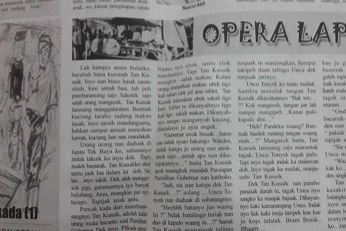 Nan Angek Garangko, sabananyo antah sia-sia sajonyo. Dikecekan Tim Sukses, namonyo indak ado tadaftar doh. Dikecekan Tim Pemenang, jauah panggang dari api. Pajako sabananyo damam politik. Ingin taliek sato berperan. Nan sabananyo indak. Paliang-paliang – ondong aia ondong dadak. Urang tadorong, inyo tajilapak.